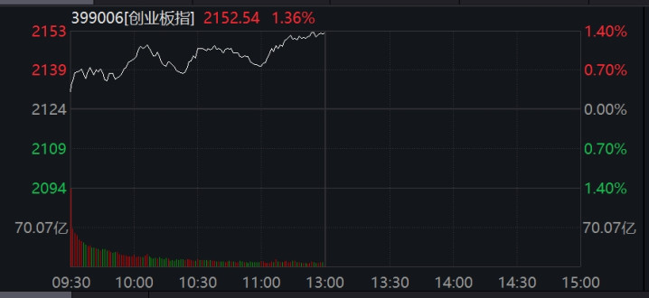截至午间收盘,上证指数涨0.07%,报3457.36点;深证成指涨0.75%,报10490.50点;创业板指涨1.36%,报2152.54点。